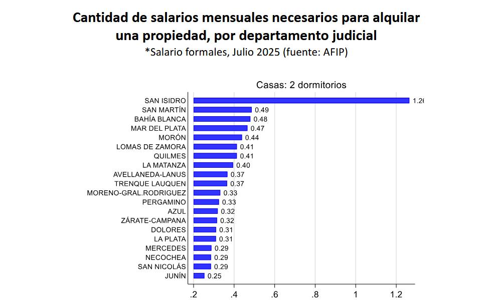 Asimismo, para alquilar una casa de dos dormitorios en Trenque Lauquen o en el resto del Departamento Judicial, con un valor mensual de 550.000 pesos, y siempre con la misma referencia del salario promedio del sector formal, una persona tiene que asignar 37% de su sueldo. En Junín, San Nicolás, Necochea o Mercedes, en cambio, es donde relativamente cuesta relativamente menos pagar el alquiler.