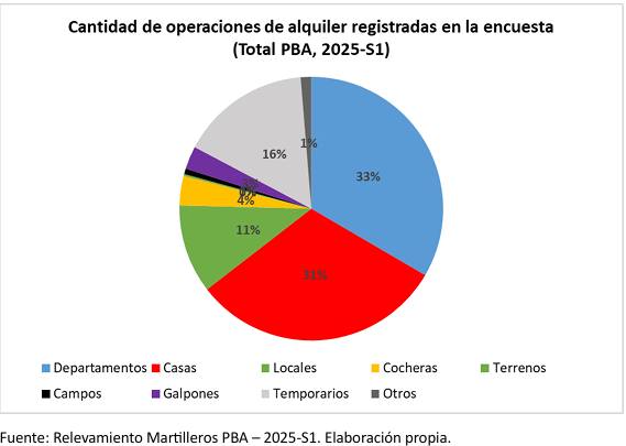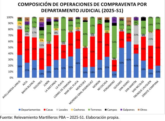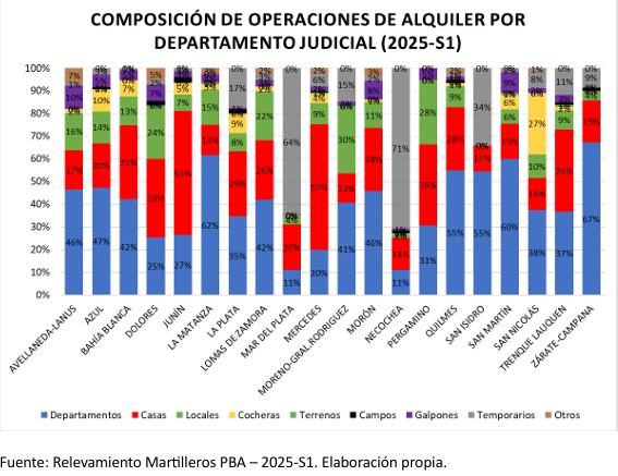 En el mismo lapso, primera mitad de 2025, y en cuanto a la composición de operaciones de alquiler, en el Departamento Judicial Trenque Lauquen 37% son arrendamientos de casas, 36% de departamentos, 11% temporarios, 9% locales, 3% galpones, 2% cocheras, 1% terrenos y 1% otros, mientras que el promedio general provincial se desglosa del siguiente modo: Departamentos (33%), casas (31%), temporarios (16%) y Locales (11%), entre las más importantes.