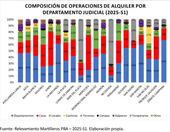 La composición cambia fuerte entre plazas: Predomina la vivienda en casi todos los Departamentos Judiciales, pero con perfiles marcados, mientras en Mar del Plata, Quilmes y San Isidro hay un alto peso de departamentos (50%); Morón y Zárate-Campana es mayor la demanda de casas (59% y 60%); y La Plata y Pergamino se distinguen por terrenos (41% y 54%).